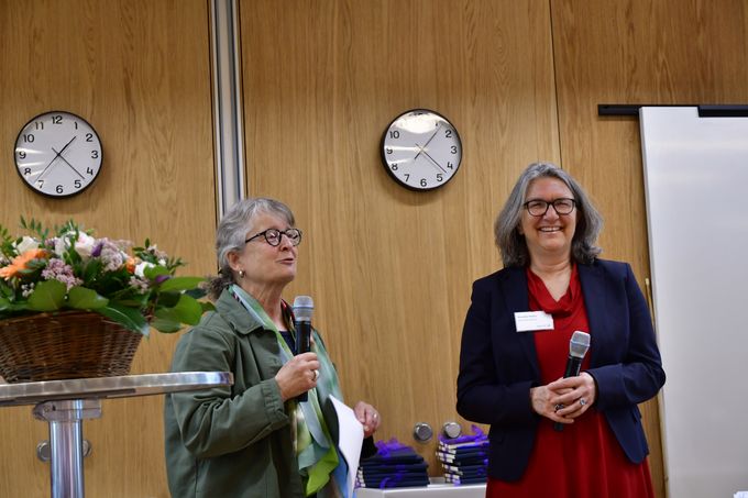 Nicole Probst-Hensch (left) discusses Exposome Science with Annette Peters, Director, Institute of Epidemiology, Helmholtz Munich. (Photo: Swiss TPH)