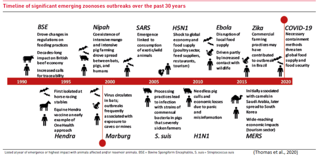 Many important lessons can be learned from cases in past years to clarify the challenges of One Health and food safety, particularly in Europe. For example, Norovirus contaminated raspberries, Escherichia coli in sprouts, and Bovine spongiform encephalopathy (mad cow) in cattle. The mad cow case was a prime example of why a One Health approach must be considered when it comes to controlling foodborne illnesses at the early stage of an outbreak. Public health and food safety aspects were overlooked, which in turn led to mad cow spreading across Europe and increased consumer exposure.